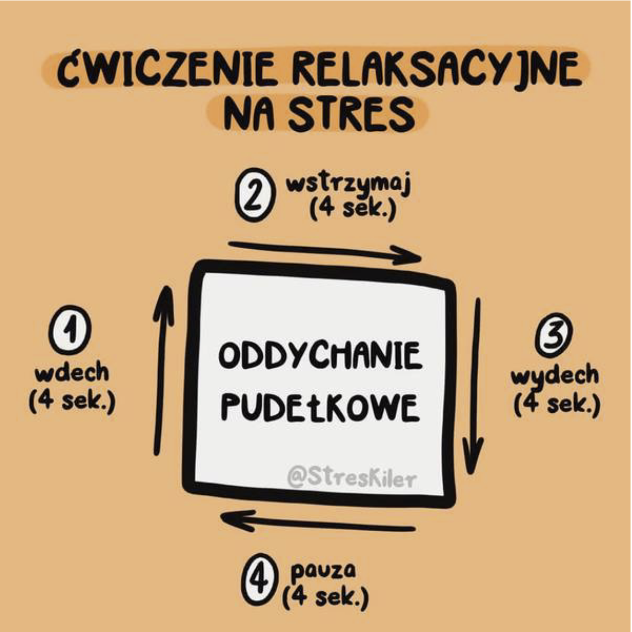 ODDYCHANIE „NA KWADRAT” - pozwala uspokoić ciało w stresującej sytuacji (np. przed egzaminem). Warto praktykować go, gdy widzimy że nasz organizm jest zestresowany: