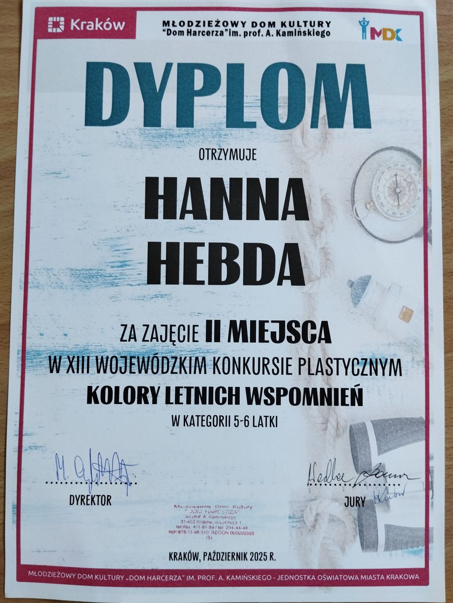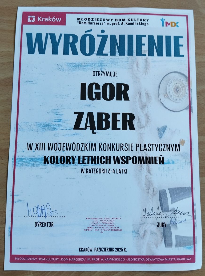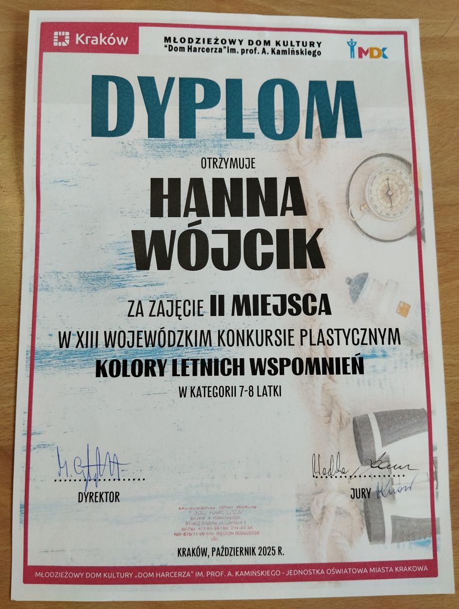 W piątek 24.10.2025 odbyło się wręczenie nagród w XIII Wojewódzkim Konkursie Plastycznym „Kolory letnich wspomnień” organizowanym przez Młodzieżowy Dom Kultury w Krakowie.