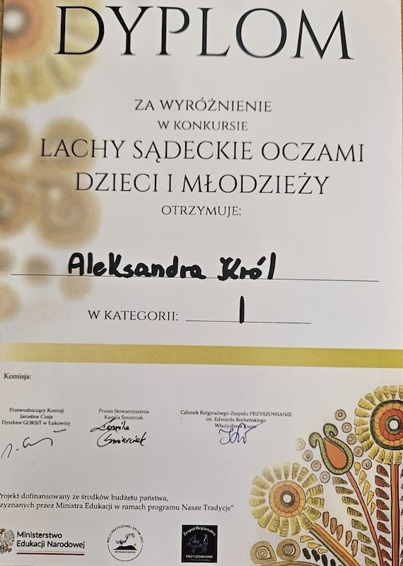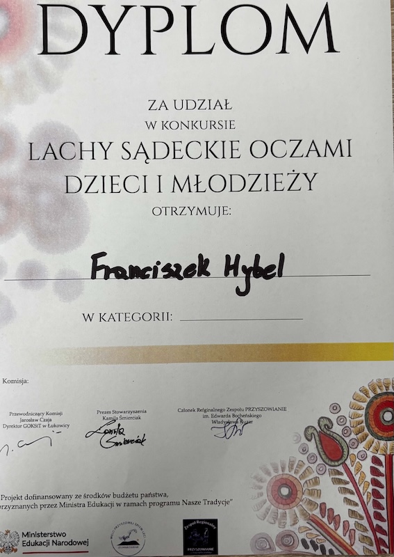 W sobotę 15.11.2025 r. w Świetlicy Wiejskiej w Przyszowej odbyło się podsumowanie warsztatów taneczno-wokalnych, warsztatów muzykowania ludowego i konkursu plastycznego „Lachy Sądeckie oczami dzieci i młodzieży” organizowanego przez Stowarzyszenie „Welo Przyszowej śpiyw leci” dofinansowanego ze środków budżetu Państwa, przyznanych przez Ministra Edukacji w ramach programu NASZE TRADYCJE. Uczniowie naszej szkoły wzięli udział zarówno w warsztatach jak i w konkursie plastycznym, osiągając wysokie miejsca.