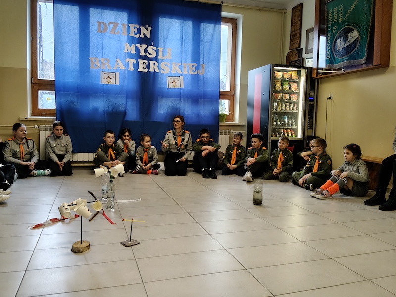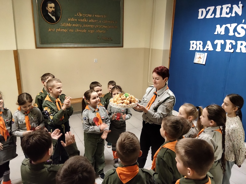 Co roku, 22 lutego, obchodzone jest święto zwane Dniem Myśli Braterskiej. Z tej też okazji, Drużyna Wielopoziomowa WESOŁE KOZAKI, spotkała się na wspólnej zbiórce, by uczcić to, jakże ważne, święto przyjaźni. Spotkanie rozpoczęło się od tradycyjnej obrzędowości, po czym zuchy i harcerze, dzieląc się na szóstki oraz zastępy, przystąpiły do wykonania zadań, w trakcie których mogli bliżej poznać postać Roberta Badena - Powella, który 100 lat temu, 22 lutego, w dzień swych urodzin oraz swej małżonki, ustanowił święto harcerzy i skautów na całym świecie. Z okazji 100 - lecia Dnia Myśli Braterskiej, zuchy oraz harcerze, społem odśpiewali sto lat, a także zdmuchnęli świece na ptysiowy torcie, na cześć Roberta Badena - Powella oraz jego żony Olave Baden - Powell.